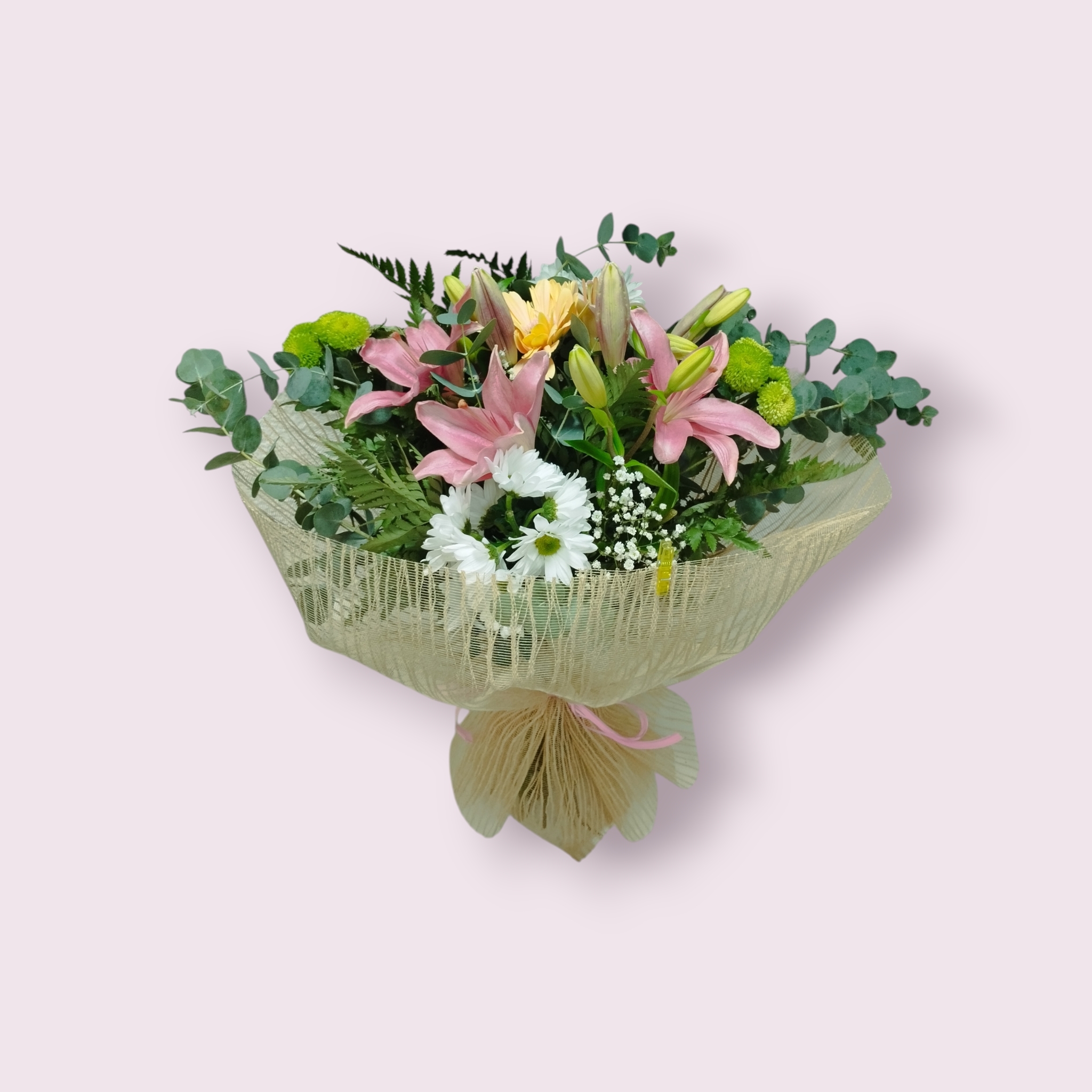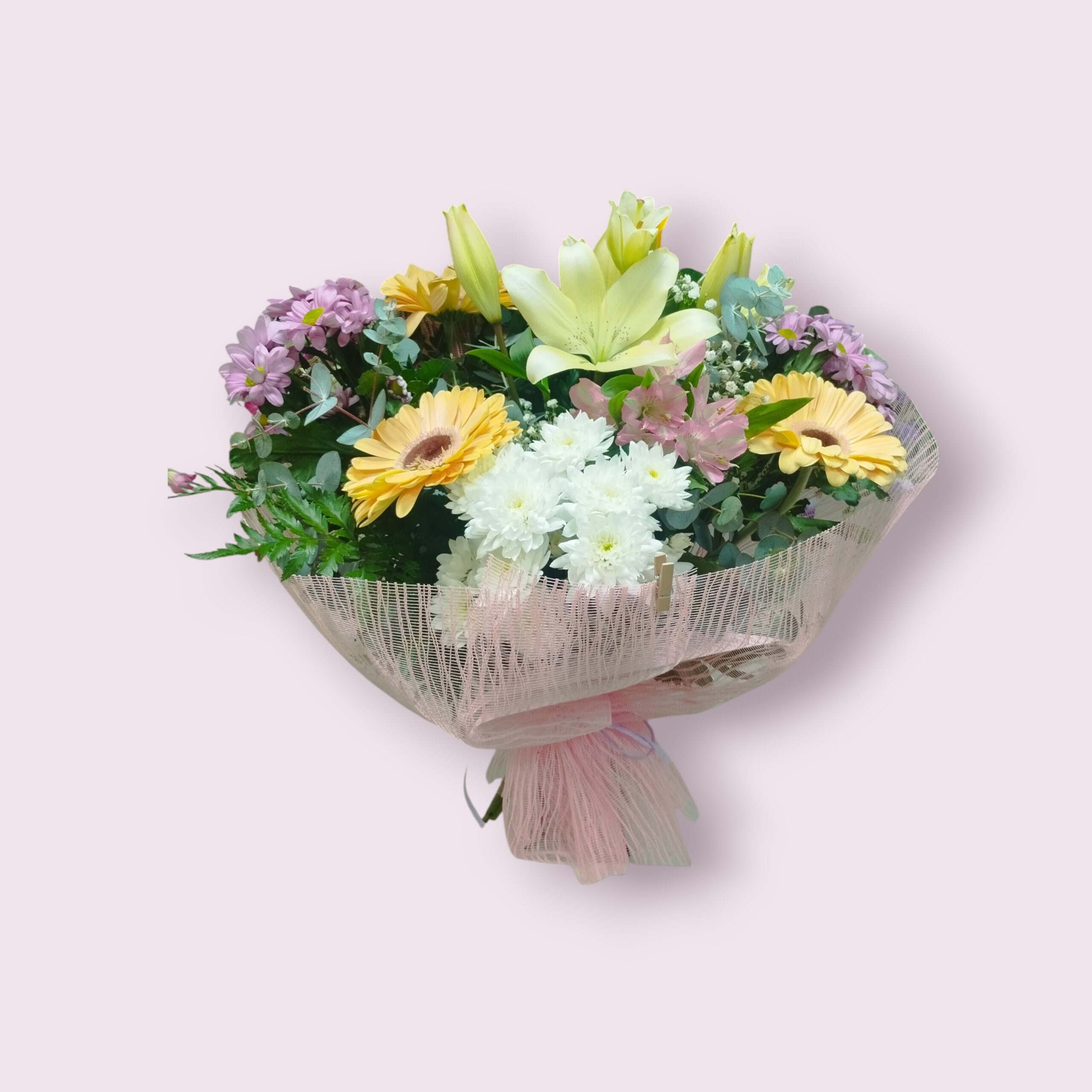 Rango de precios: desde 25,00€ hasta 100,00€ (IVA incl.)Precioso ramo de flores naturales variadas envuelto en papel de regalo.